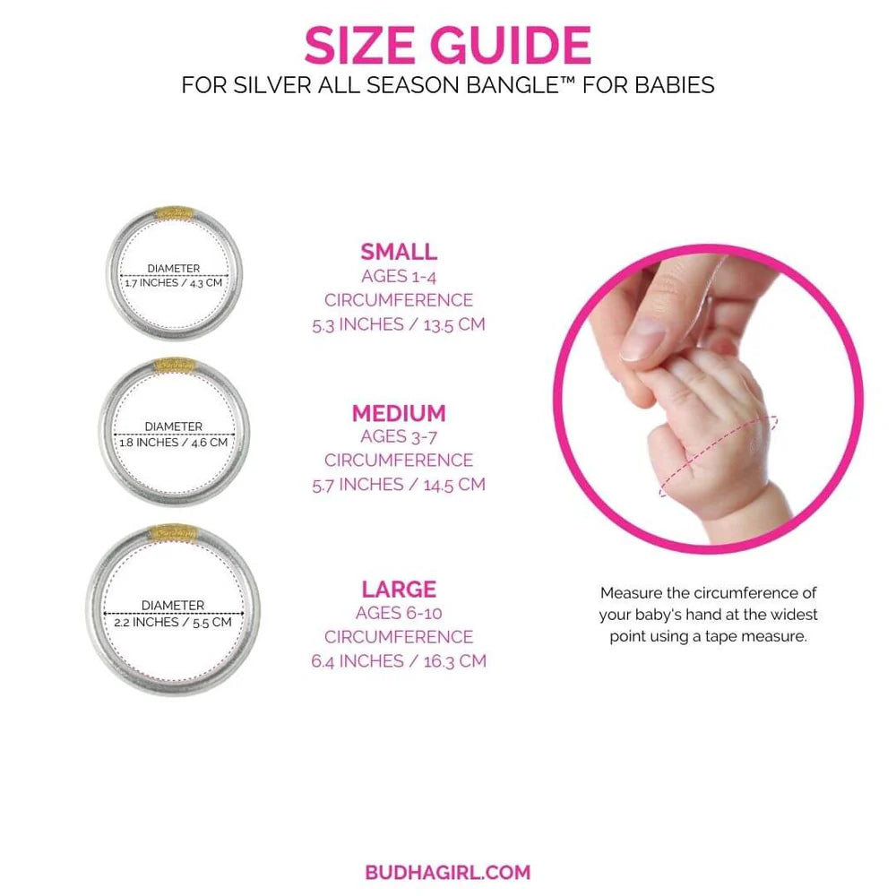 All Season Bangle™ (ASB™) for Babies are the perfect way to teach the new generation of BuDhaGirls about Mindful Glamour®. Baby ASB are available in three sizes 1-4 year old is small, 3-5 is medium, and 5-7 is large. Baby ASB are sold individually and are made of flexible polyvinyl carbonate tubing, so they are waterproof, soundless, weightless and can easily be washed at any time.