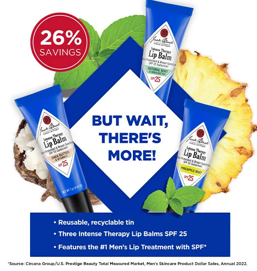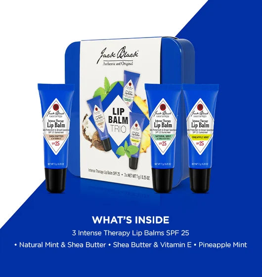 A trio of soothing Intense Therapy Lip Balms SPF 25 featuring award-winning flavor favorites and new Pineapple Mint. Packaged in an exclusive reusable, recyclable Jack Black® tin, this is a gift–for yourself or someone else–that lasts long after the lip balms are gone.