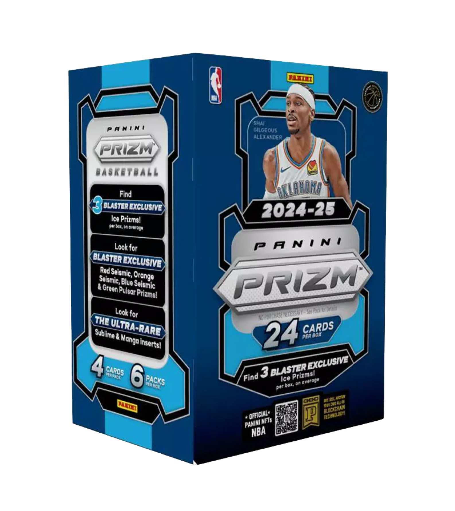 2024-25 Panini Prizm NBA Basketball brings one of the most popular chromium retail products of the season, featuring a deep base set of current stars and top rookies, tons of parallels, eye-catching inserts and chances at autograph hits — plus exclusive retail-only chase Prizms like Red Seismic, Orange Seismic, Blue Seismic and rare Green Pulsar parallels in blaster configurations.