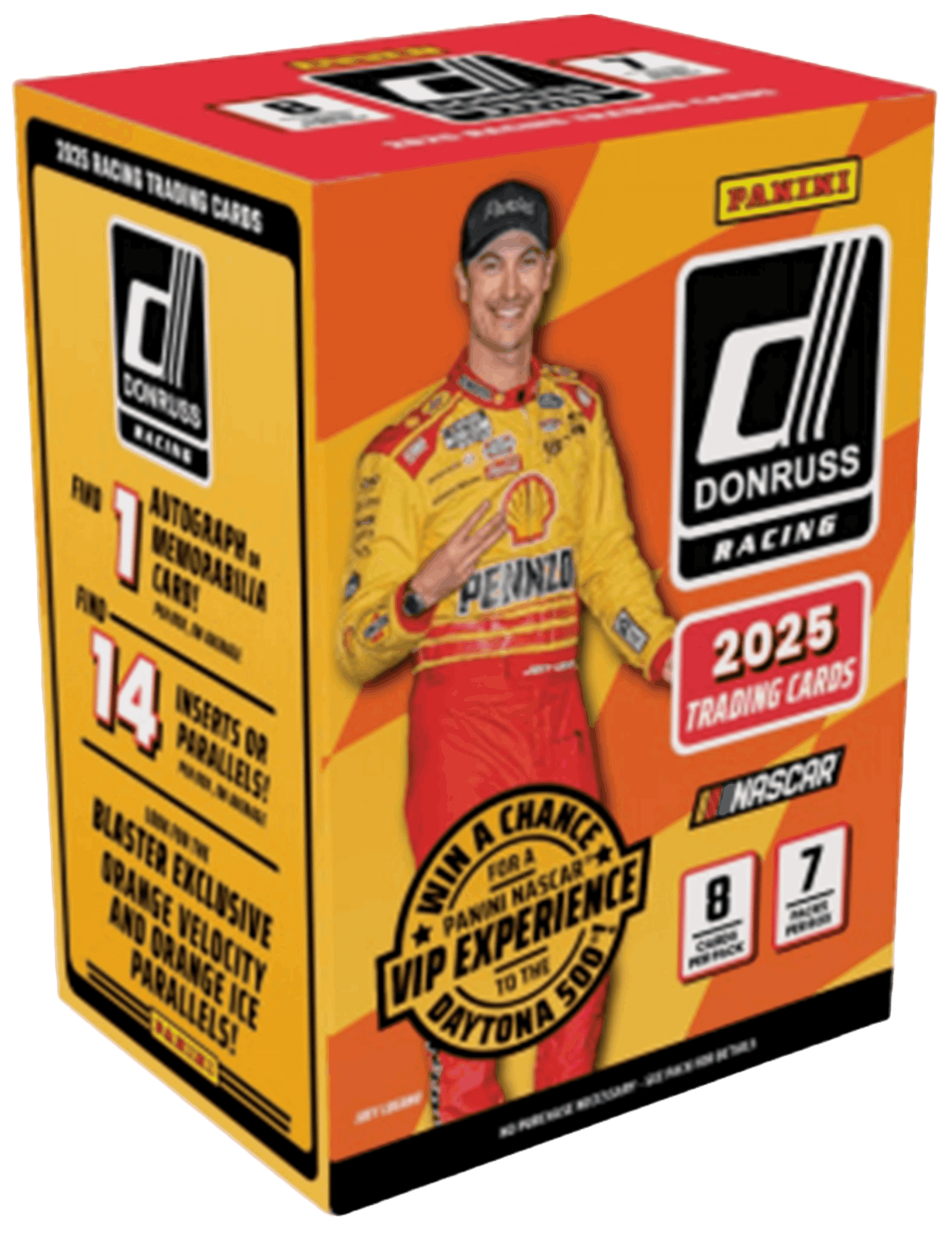 Panini presents the 2025 NASCAR Donruss Racing Tradingaster Box. Each box contains 7 packs with 8 cards per pack. Look for an Autograph or Memorabilia Card! Look for Inserts or Parallels! Look for the Blaster Exclusive Orange Velocity and Orange Ice Parallels! Content may vary. Collect them all.
